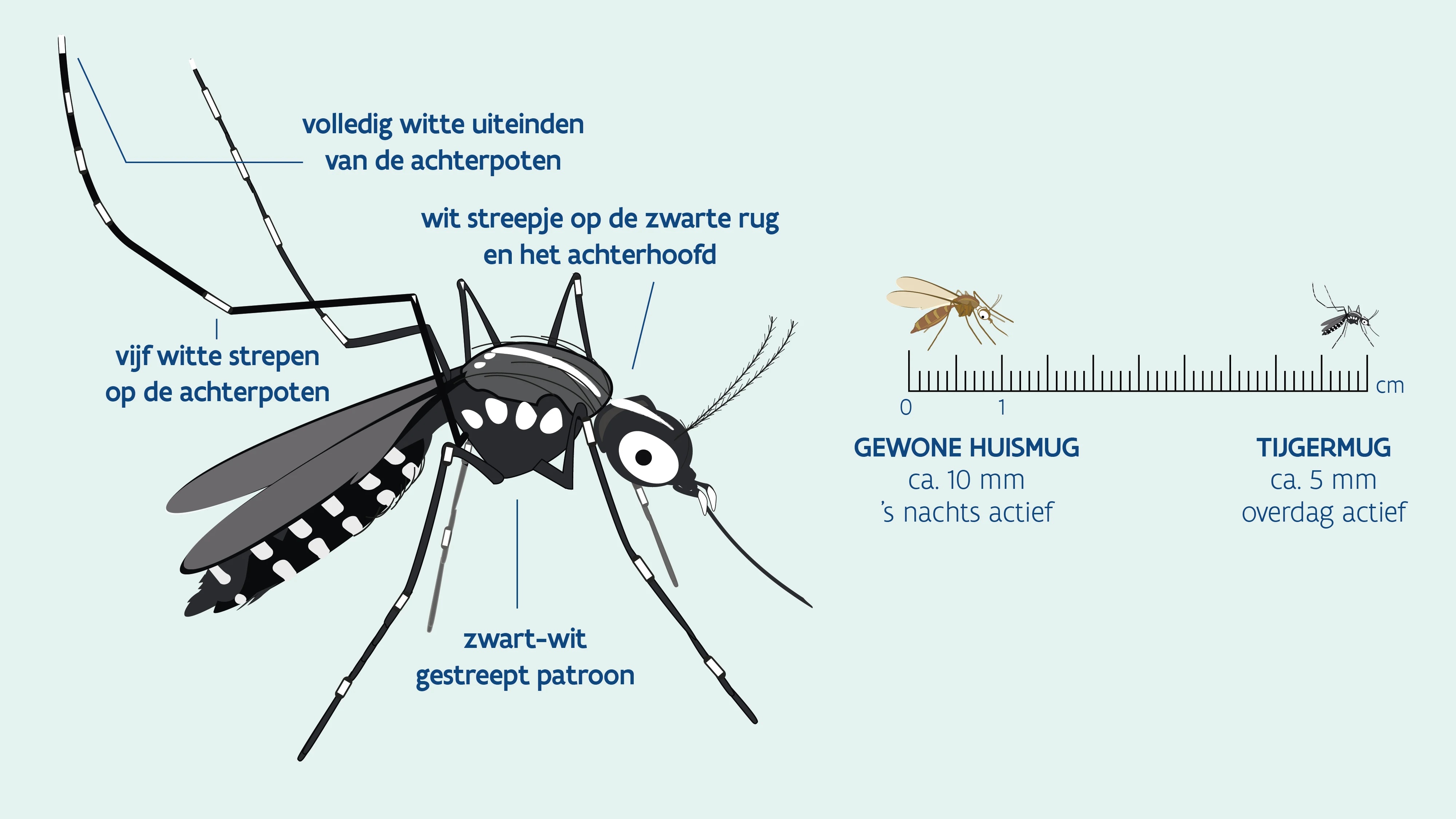 De campagne roept in de eerste plaats op om tijgermuggen te melden. Dat kan via muggensurveillance.be. Tijgermuggen hebben een zwart-wit gestreept patroon, wit streepje op de zwarte rug en het achterhoofd, zijn klein: 4-5 millimeter, ongeveer half zo groot als een gewone huismug, hebben vijf witte strepen op de achterpoten, met volledig witte uiteinden en zijn agressief en steken overdag. Deze infofiche van Artsen Zonder Grenzen helpt ze te herkennen: