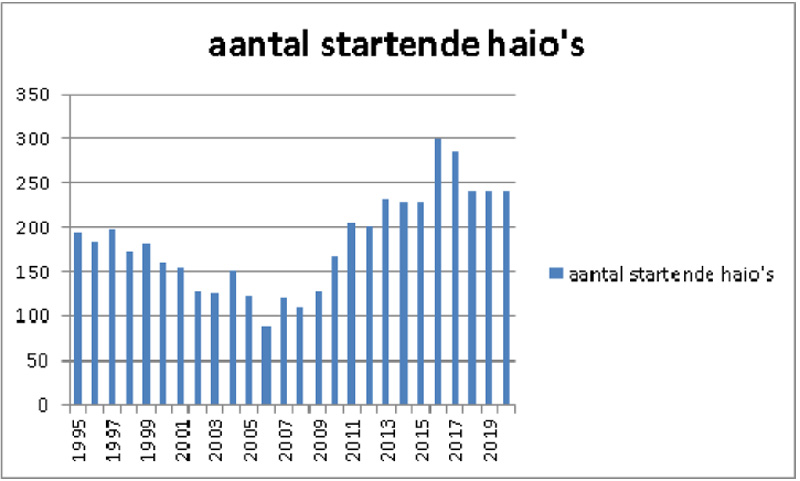 Niet alleen de verminderde uitstroom dient in rekening gebracht maar ook de toegenomen instroom. In vergelijking met enkele jaren geleden is er opnieuw een substantieel groter aantal huisartsen‐in‐opleiding (haio's) dat start met de opleiding: