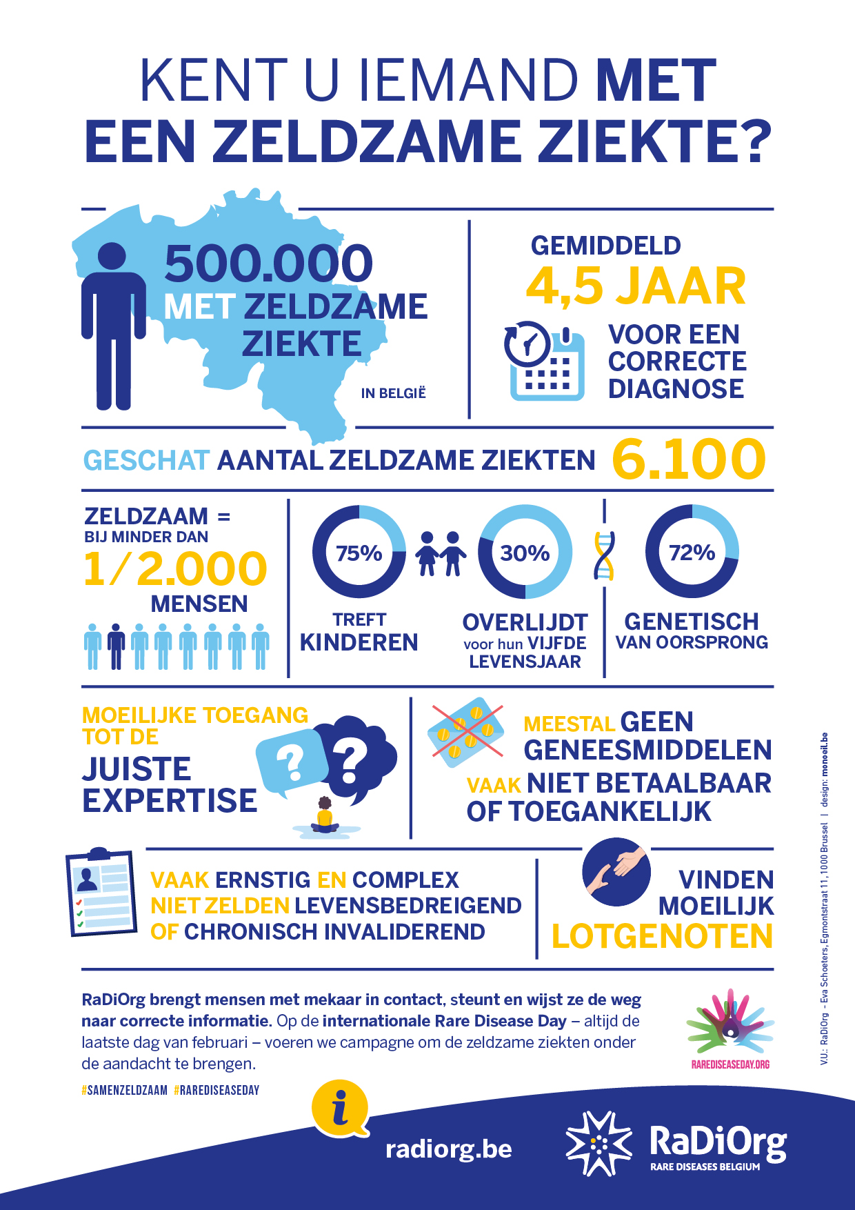 In België leven zo’n 500 000 mensen met een zeldzame ziekte, en het duurt bijna vijf jaar voor de juiste diagnose wordt gesteld. Naar aanleiding van de internationale ‘Rare disease day’ op 29 februari verspreidt RaDiOrg, de Belgische Rare Disease Organisatie, een infofiche om het bewustzijn hierover te vergroten.