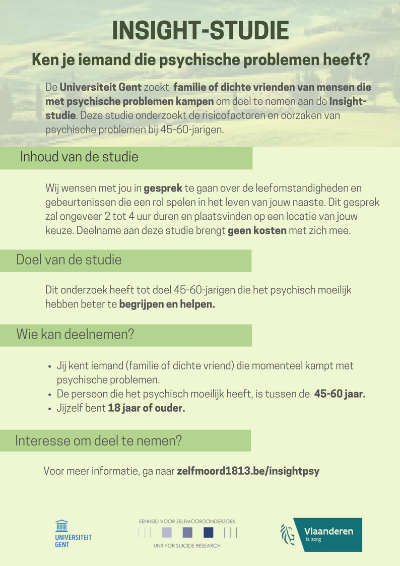Aan de Eenheid voor Zelfmoordonderzoek (UGent) loopt momenteel de Insight-studie, een onderzoek naar zelfdoding bij 45-60 jarigen. Hiervoor is men op zoek naar nabestaanden die iemand verloren zijn door zelfdoding en mensen die iemand kennen die het psychisch moeilijk heeft. U kunt deze studie mee bekend maken door infofiches te verspreiden.