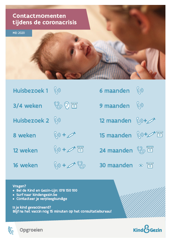 De andere geprogrammeerde basisconsulten zoals het startgesprek, de huisbezoeken op 2 en 6 weken, de consulten op 6 en 9 maanden gebeuren niet-fysiek via telefonie of beeldbellen. Een schema van de contacten vind je in bijlage. Aanvullend blijven we verder inzetten op ondersteuning op maat.