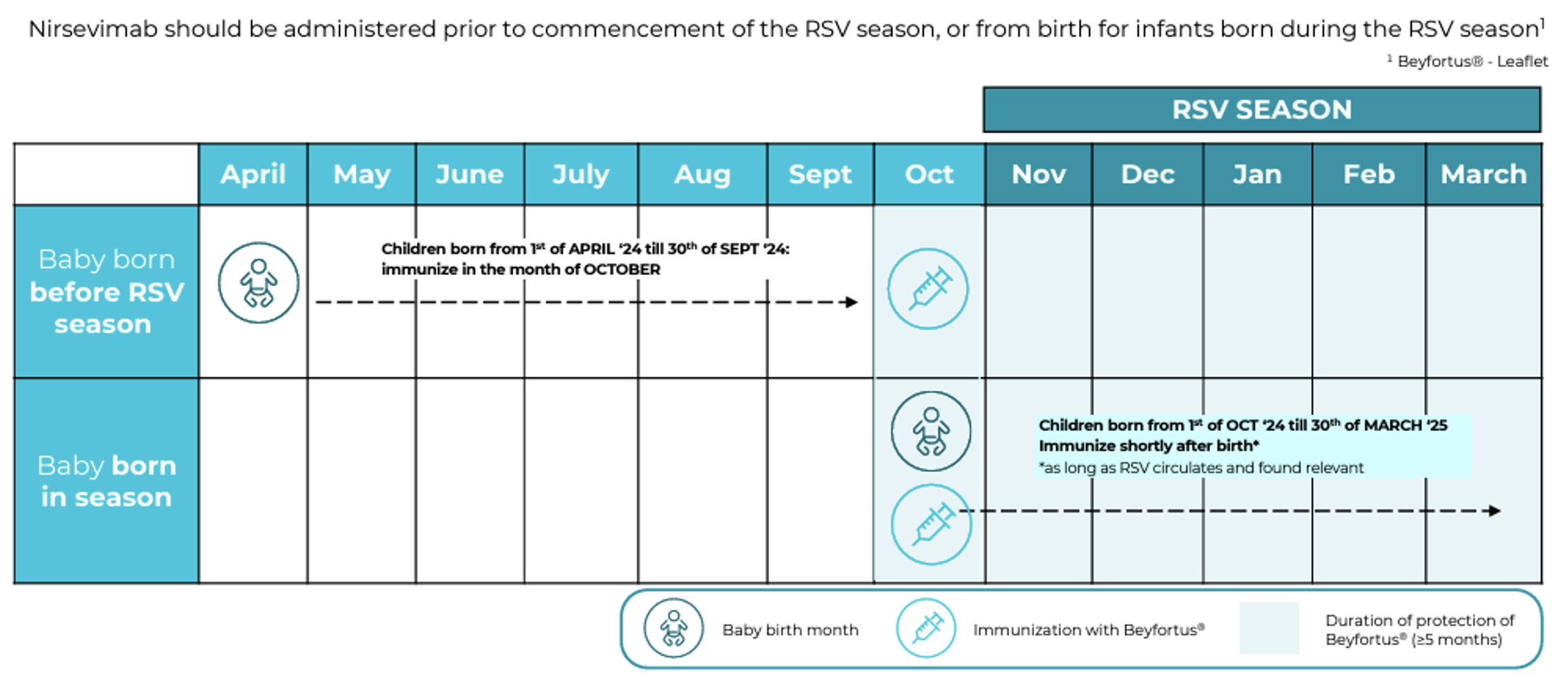 - Beyfortus™ 100mg (voor zuigelingen die >5kg wegen): ten laatste 7 oktober