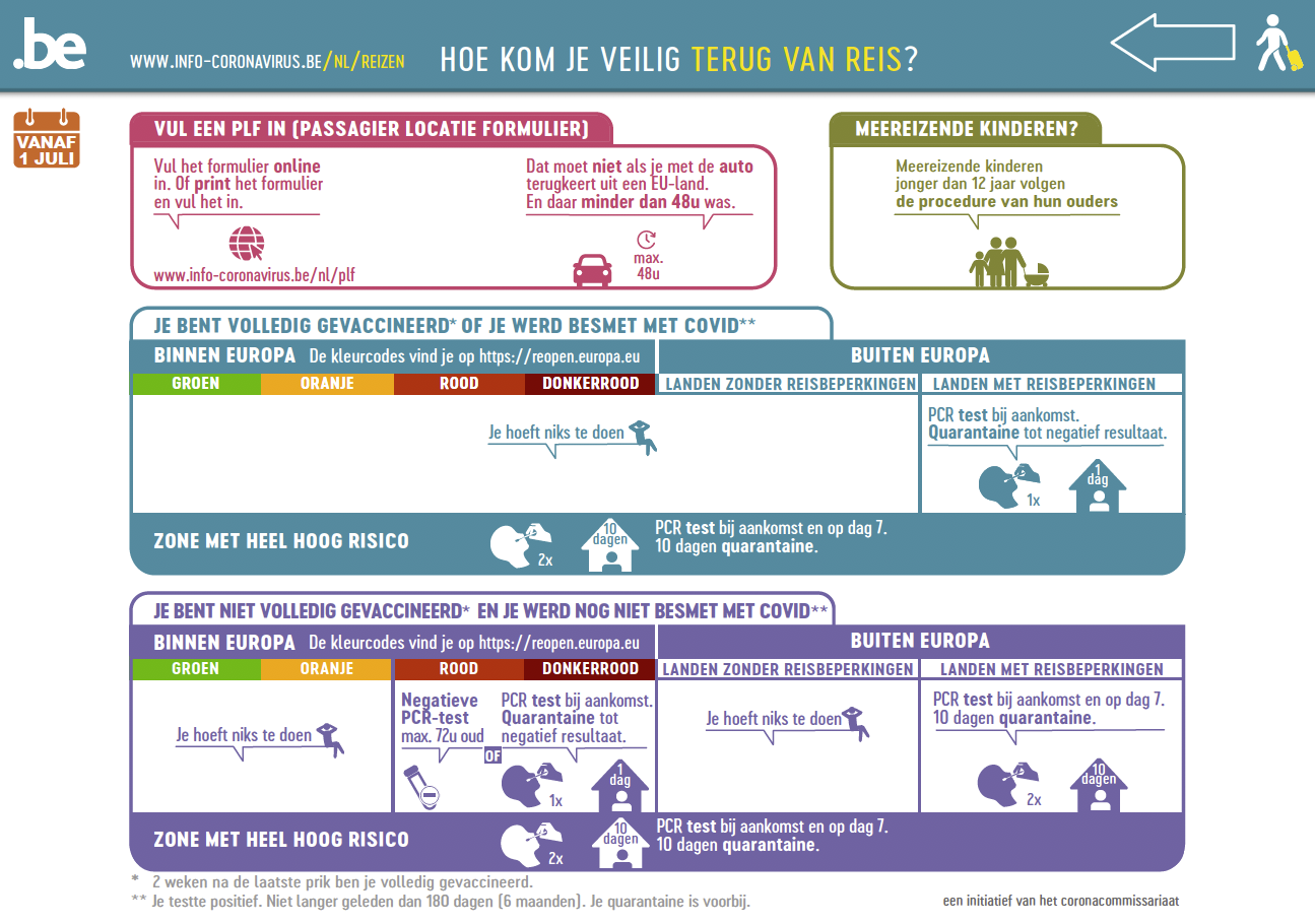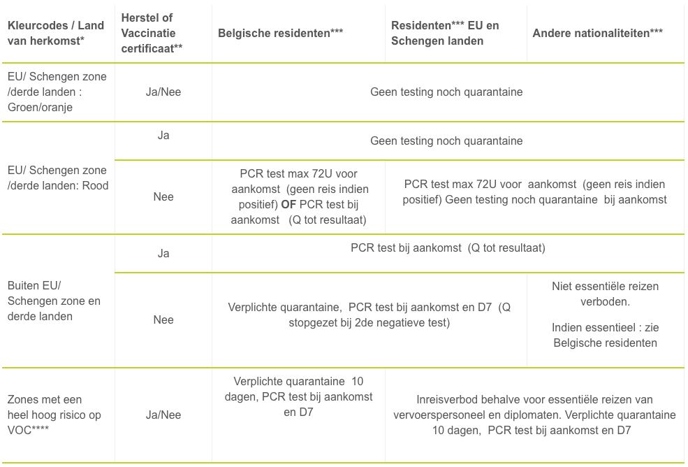 Sciensano publiceerde een tabel met de maatregelen bij aankomst in België vanuit het buitenland
