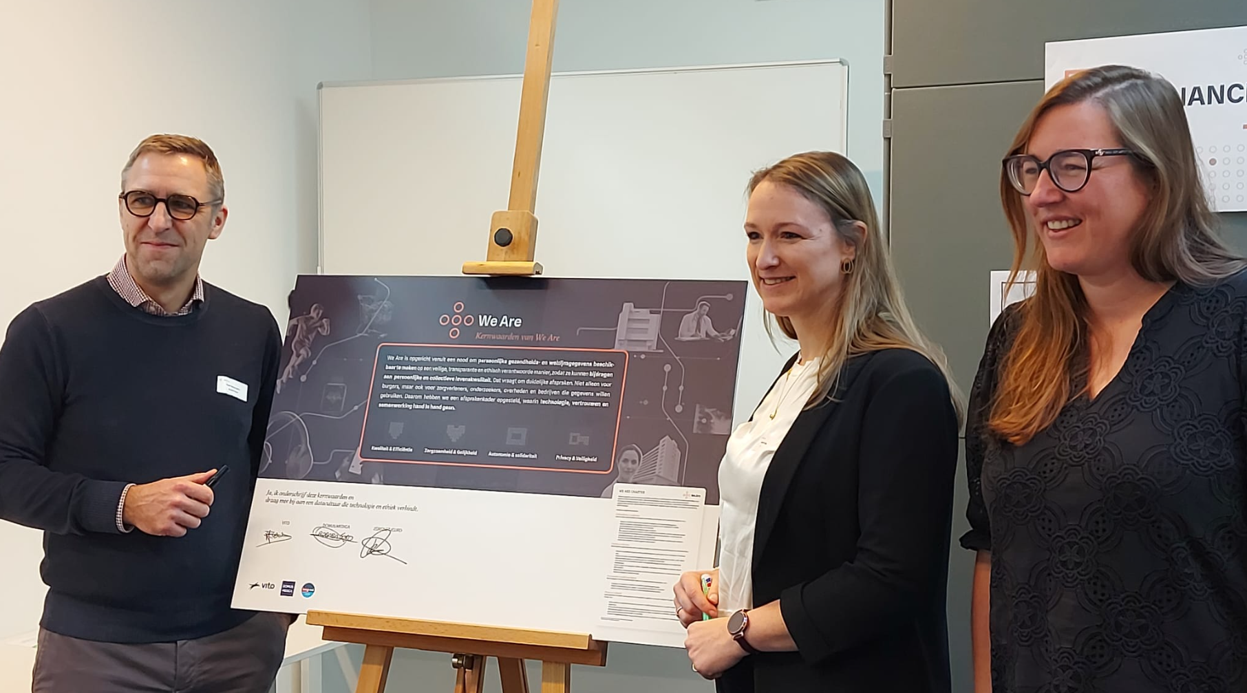 Een bijzonder moment was de officiële ondertekening van het We Are-charter. De kernpartners Domus Medica, Zorgnet Icuro en VITO plaatsten hun handtekening onder de We Are-principes en bevestigden daarmee hun engagement om: