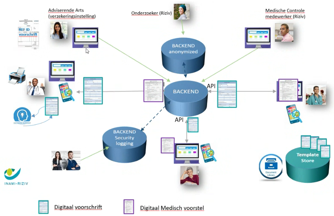 Naast zorgvrager, voorschrijver, zorgverlener en adviserend arts, zijn er binnen dit ecosysteem nog enkele andere relevante actoren: dienst Geneeskundige Evaluatie en Controle, dienst Onderzoek (statistische analyses obv geanonimiseerde database), en een Data Protection Officer.