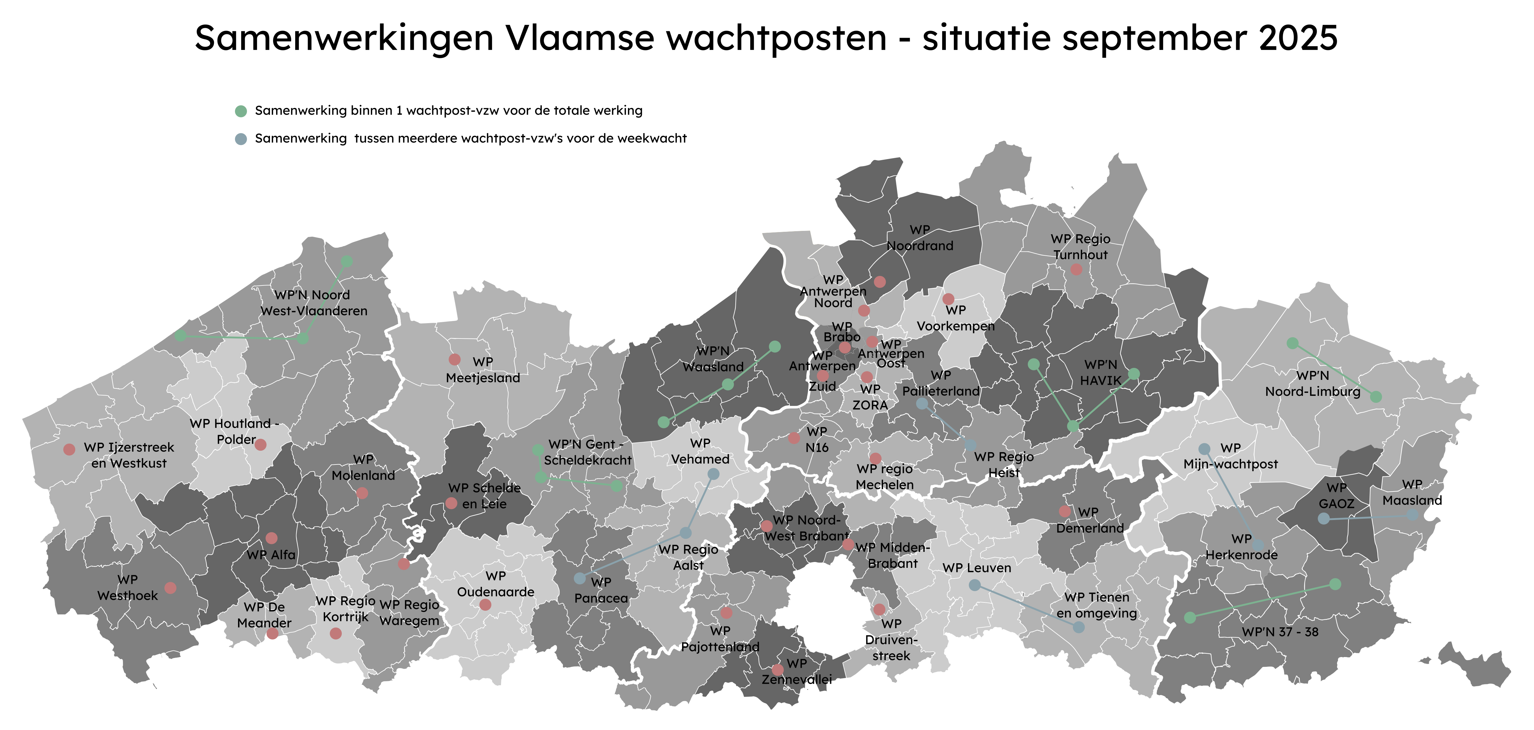 Steeds meer wachtposten gaan een onderlinge samenwerking aan om hun werking te organiseren. Onderstaande kaart geeft een overzicht van deze samenwerkingen. Een deel van de samenwerkende wachtposten baat meerdere locaties uit vanuit 1 vzw, waar doorgaans (niet altijd) verschillende huisartsenkring-vzw's onderliggend aan verbonden zijn. Een ander deel van de samenwerkende wachtposten behoudt verschillende wachtpost-vzw's (met mogelijks ook daaronder nog meerdere huisartsenkring-vzw's) en gaat van daaruit een samenwerking aan.