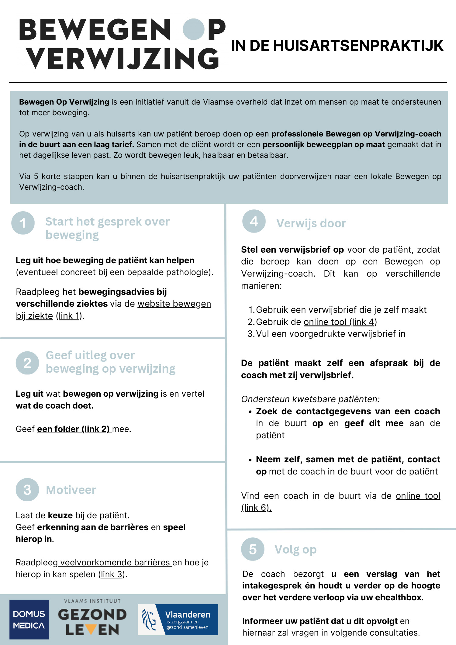 U kent ongetwijfeld patiënten die gebaat zijn met meer laagdrempelige, dagelijkse beweging als deel van een gezonde leefstijl? Daarom bestaat er Bewegen Op Verwijzing, een Vlaams project dat professioneel omkaderd is door o.a. het Vlaams Instituut Gezond Leven en Domus Medica.