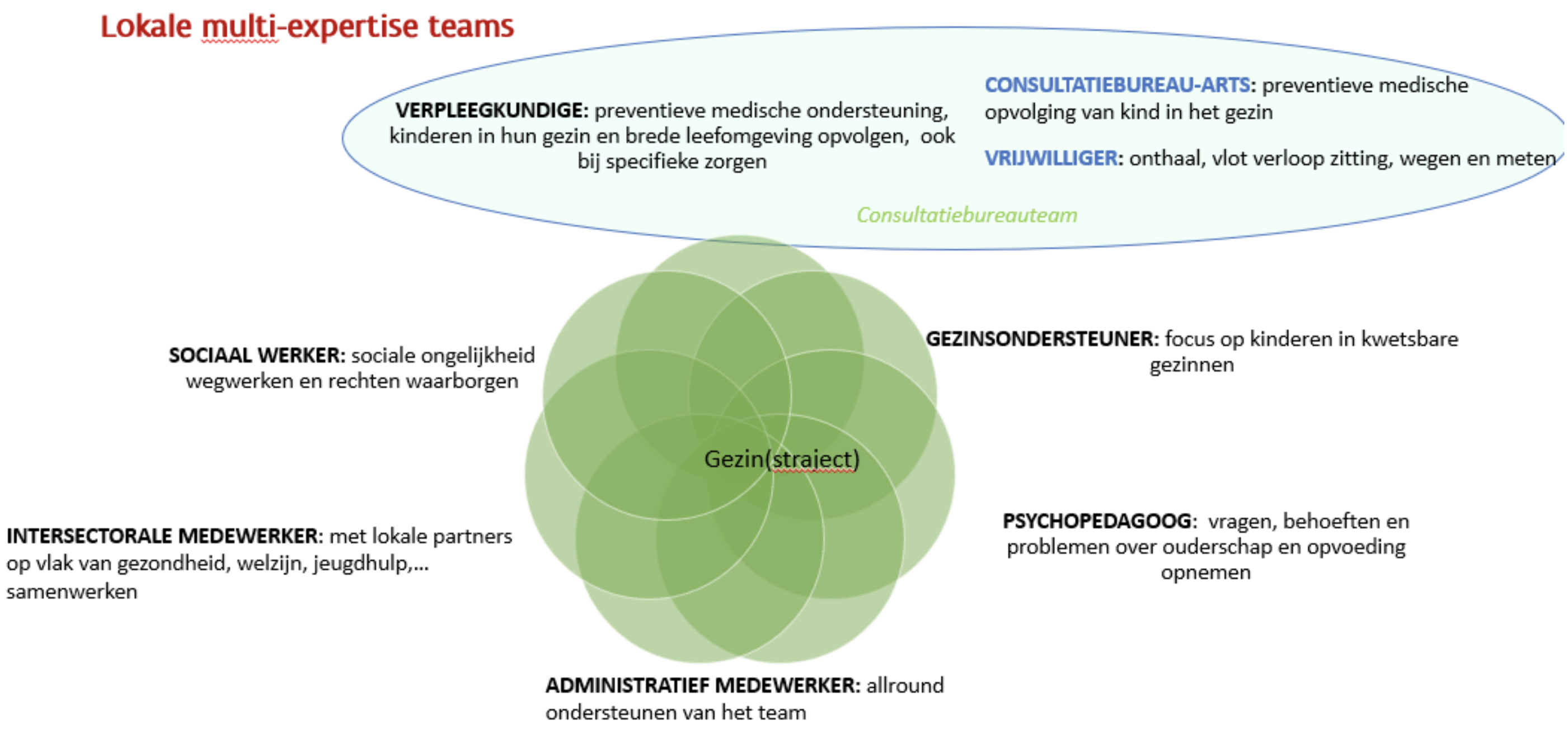 We staan klaar met onze deskundigheid over opvoeding, veiligheid en gezonde levensstijl en bieden ondersteuning op maat van het gezin. We doen hiervoor beroep op lokale multiexpertise teams waar verpleegkundigen, gezinsondersteuners, psychopedagogen, sociaal werkers elk dag het beste van zichzelf geven.