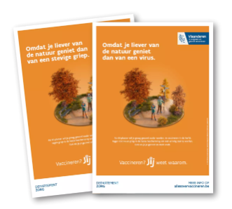 Bestel gratis de gedrukte campagnematerialen voor de najaarsvaccinatie 2025 via de Gezondheidsmakers in uw regioDepartement Zorg ontwikkelde verschillende campagnematerialen die ook in de huisartsenpraktijk gebruikt kunnen worden, zoals affiches, folders en wachtkamerschermen. Via de Gezondheidsmakers kan u gratis de gedrukte materialen bestellen. Bestel hier de gedrukte campagnematerialen via de Gezondheidsmakers |