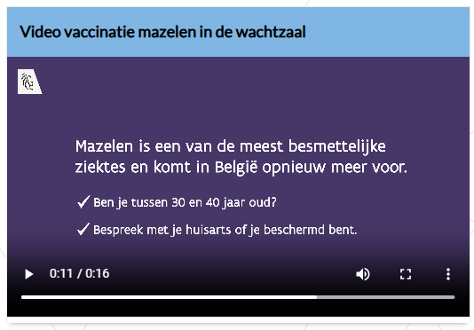 Wachtkamerfilmpje sensibilisatie 30-40-jarigenDepartement Zorg ontwikkelde een kort en geluidloos filmpje dat afgespeeld kan worden in de wachtkamer van de huisartsenpraktijk. In dit filmpje worden 30-40-jarigen opgeroepen om hun vaccinatie rond mazelen te bespreken met hun huisarts. Download hier het wachtkamerfilmpje rond mazelen voor 30-40-jarigen